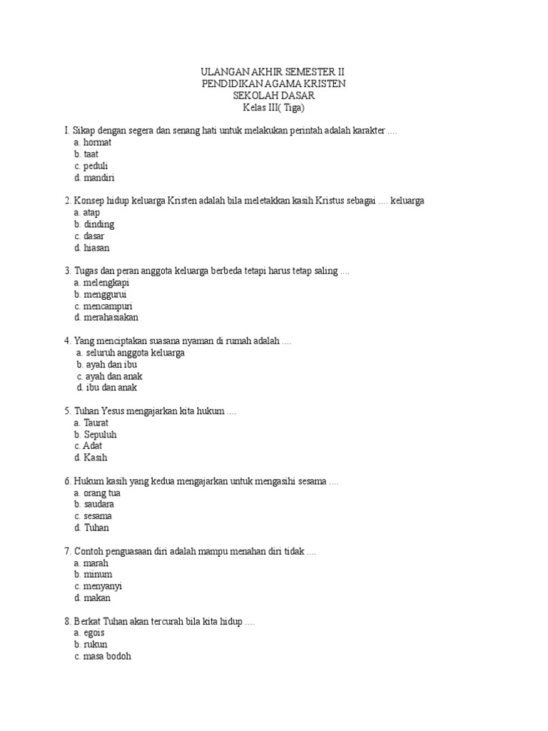 Soal agama kristen kelas 4 semester 1 dan kunci jawaban.
